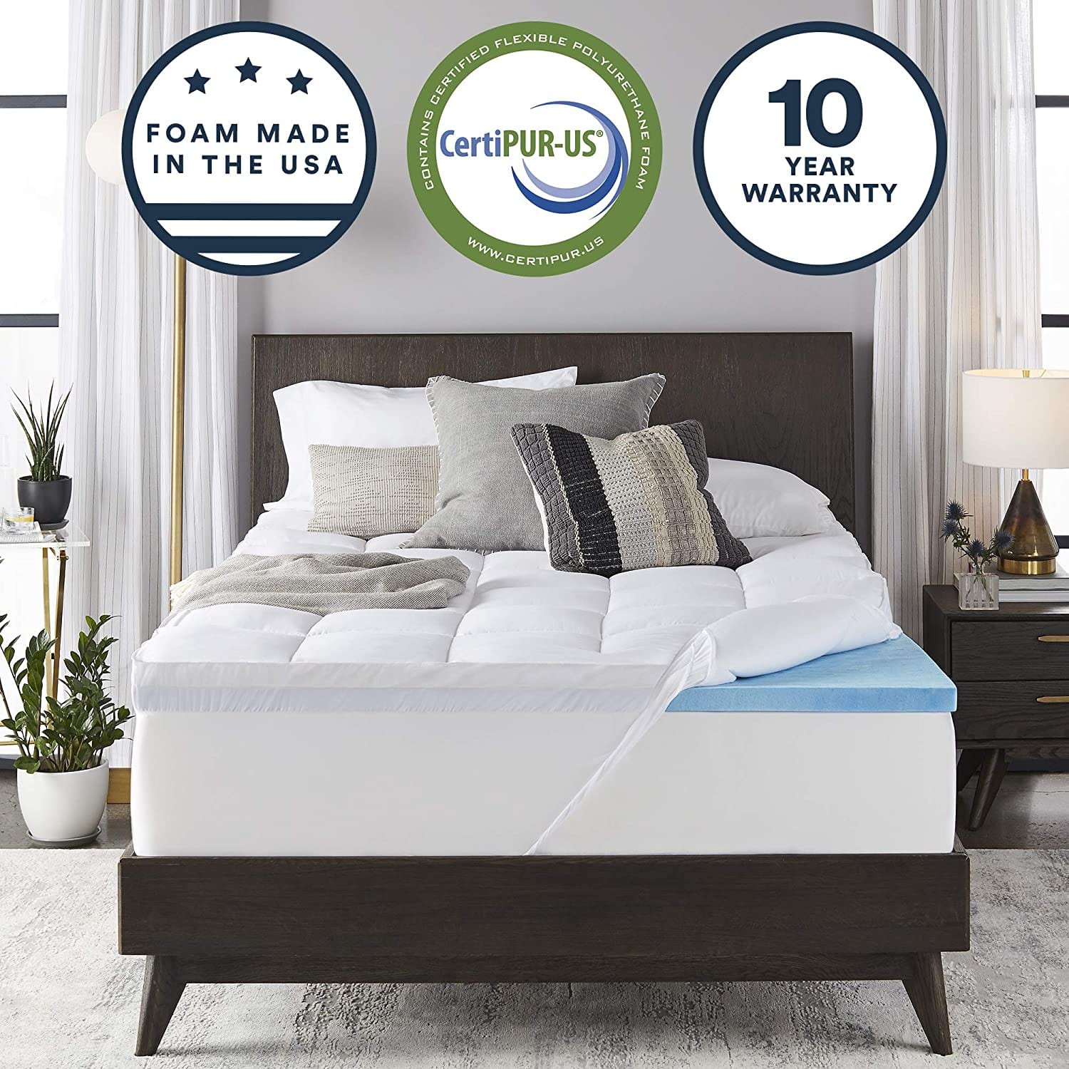 This product features a sleek design with a plush comforter and enables you to get high-quality sleep. Sleep Innovations uses its innovative, two-layer design to turn your bed into a luxurious sleep space. To give you maximum comfort and support, the mattress topper combines 2” of quilted fiberfill with 2” of cooling gel memory foam for added therapeutic value. This mattress topper has also been CertiPUR-US certified, which is only awarded to bedding or upholstery that meet the rigorous standards for emissions, performance, and durability.